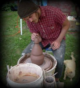 Lou Lourdeau's pottery pics, potter spinning clay