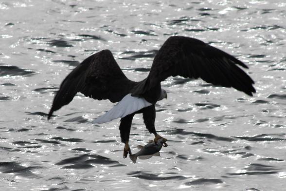There are a record number of eagles wintering along the Mississippi River in the Midwest this year. They were forced to migrate when ice coverage in northern states blocked access to their major food source. They benefit from the locks and dams in this area, where turbulent waters are free of ice and plentiful with stunned gizzard shad.